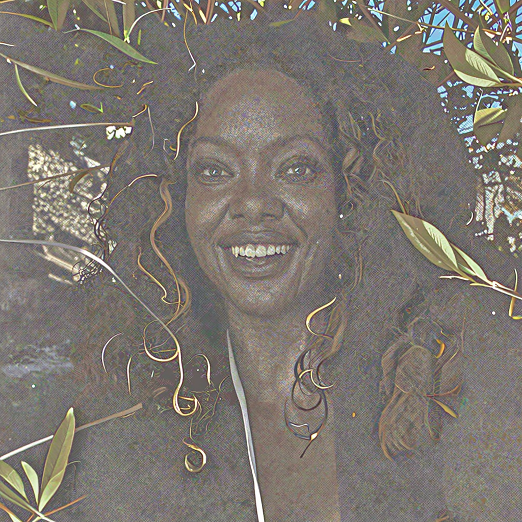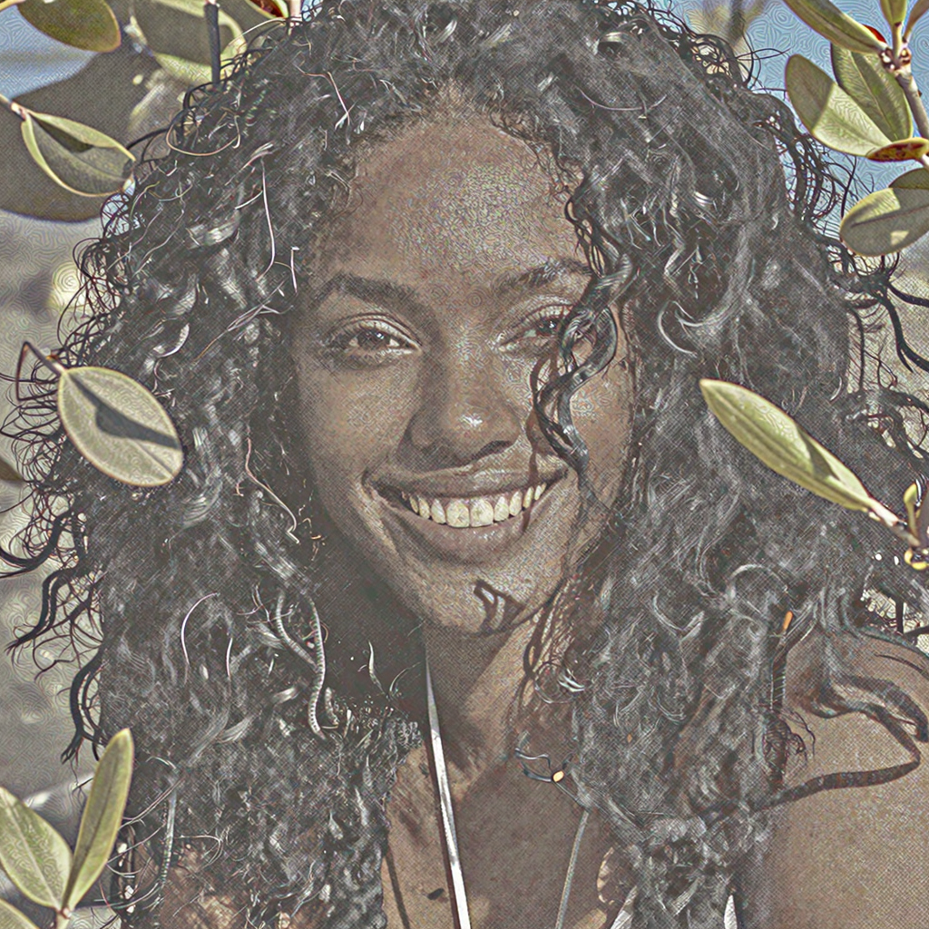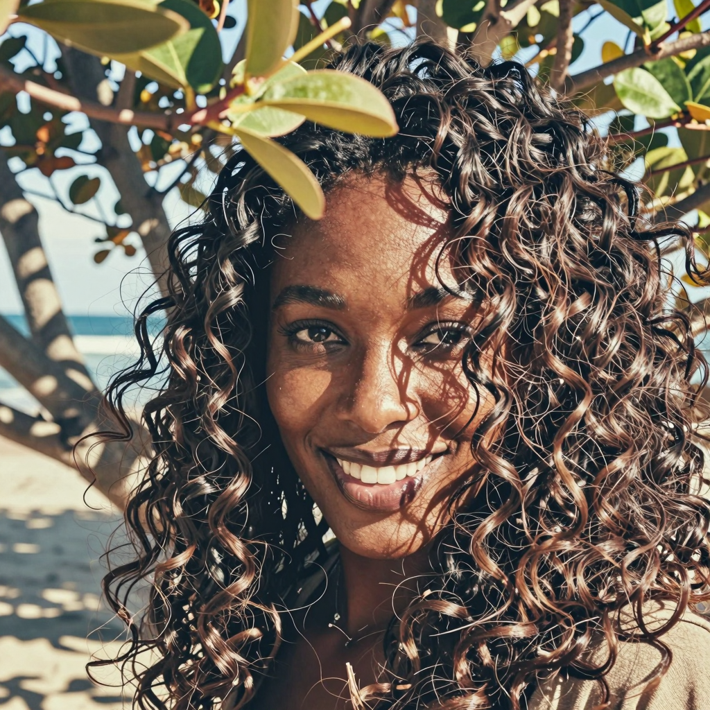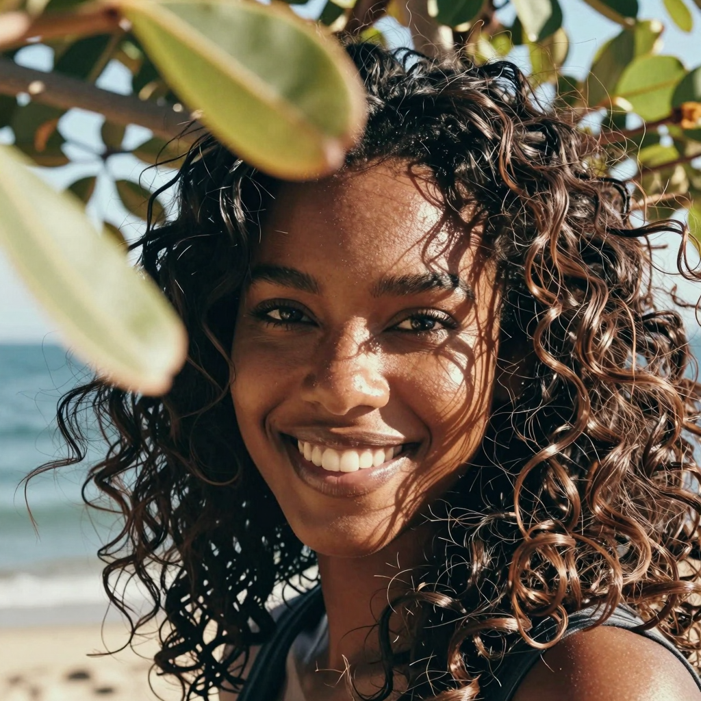Black female with thick wavy hair, is spontaneously smiling to the camera, there are some out of focus tree leaves in front of her. Breezy seaside light, warm tones, cinematic close-up.
