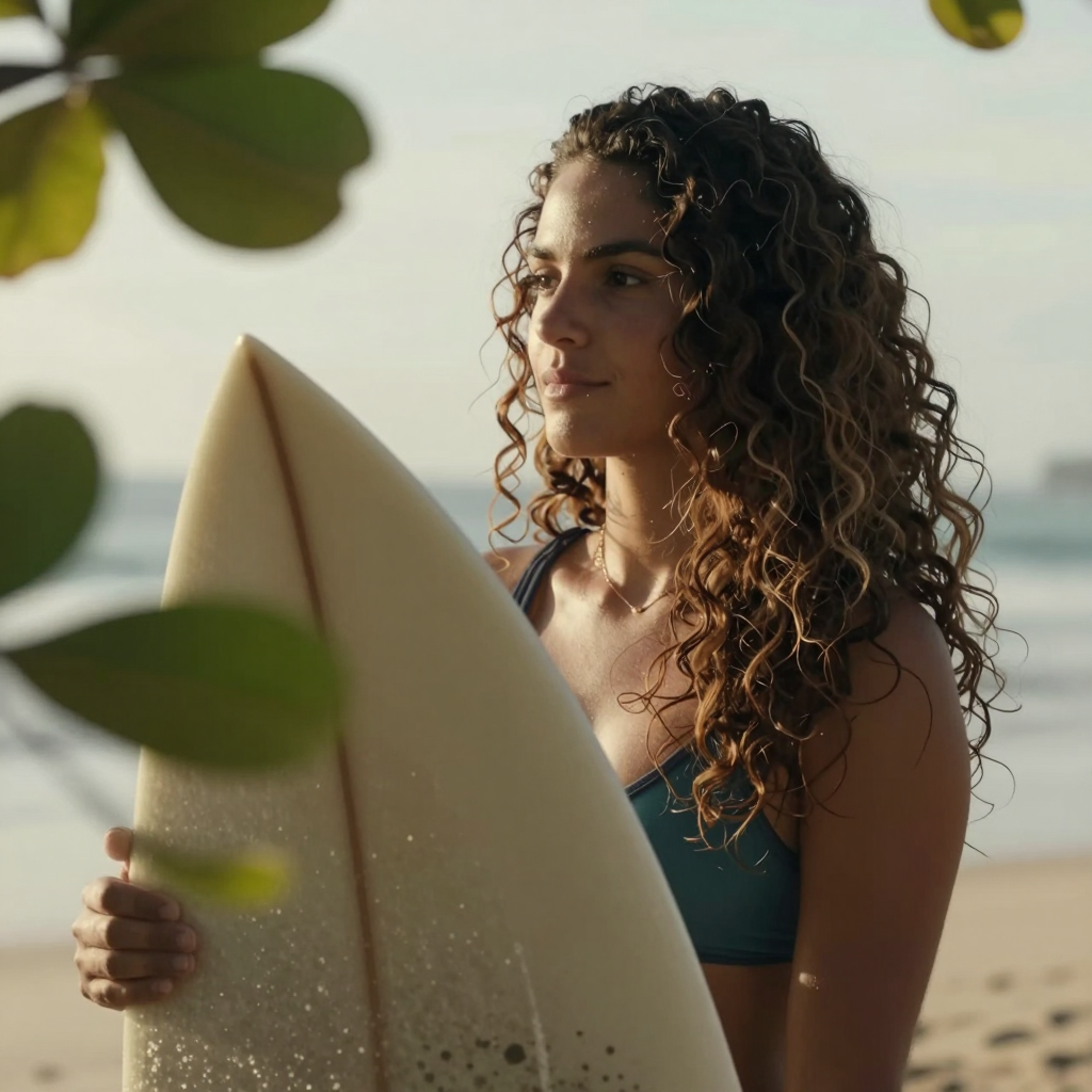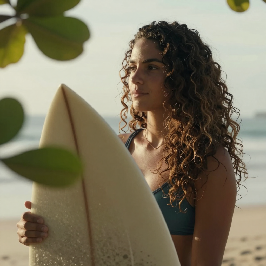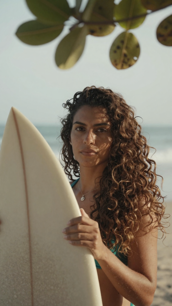 Brazilian female with thick wavy hair, is holding her surf board, there are some out of focus tree leaves in front of her. Breezy seaside light, warm tones, cinematic close-up.