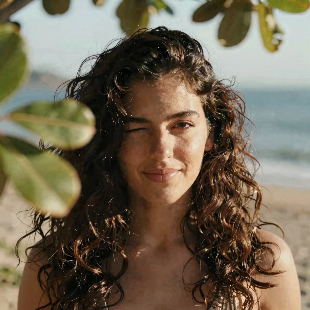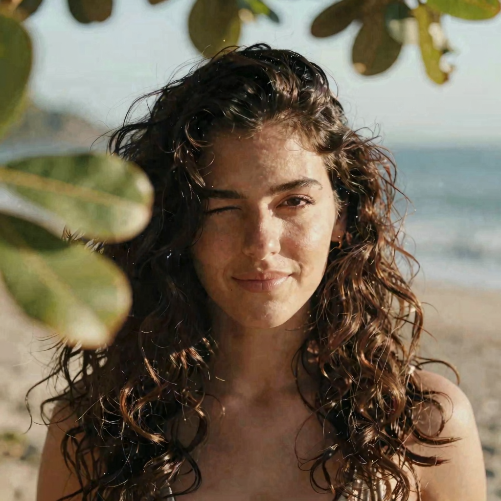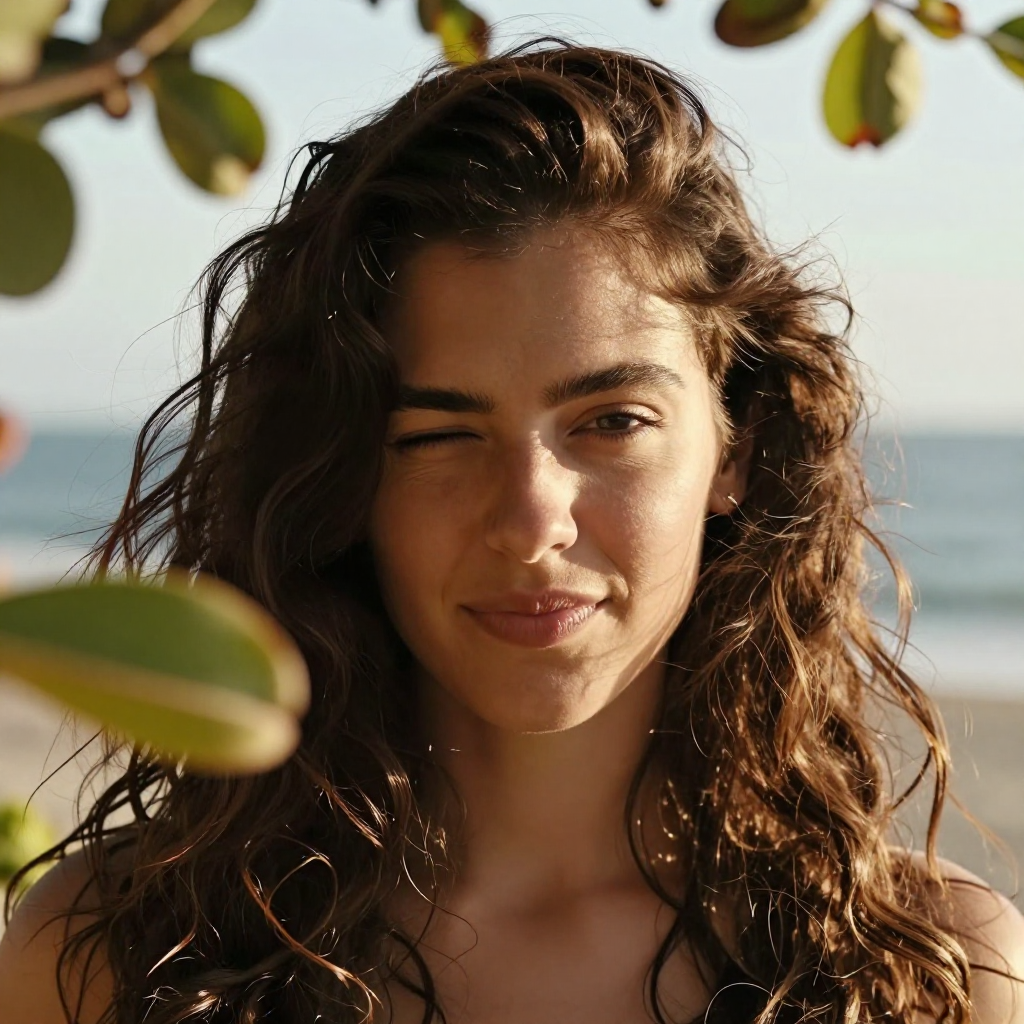 Latina female with thick wavy hair, blinking to the camera, there are some out of focus tree leaves in front of her. Breezy seaside light, warm tones, cinematic close-up.