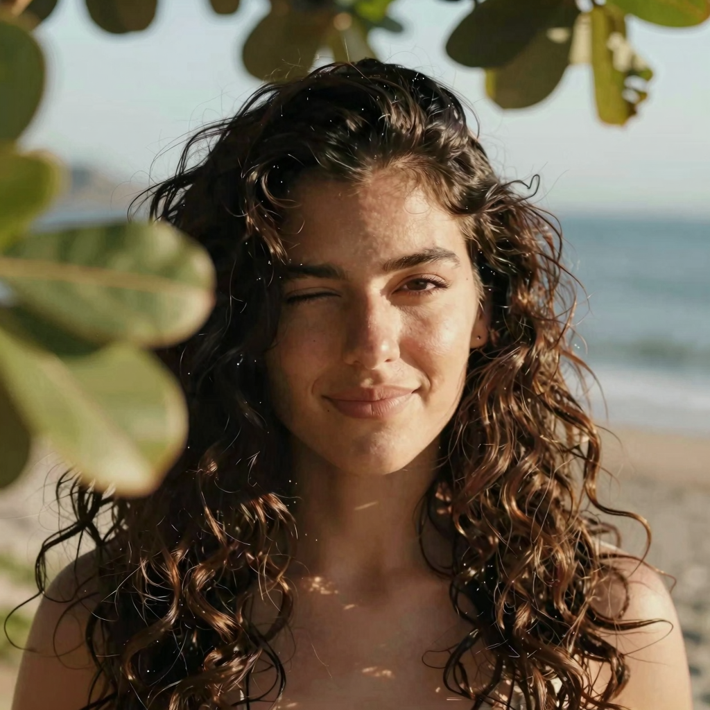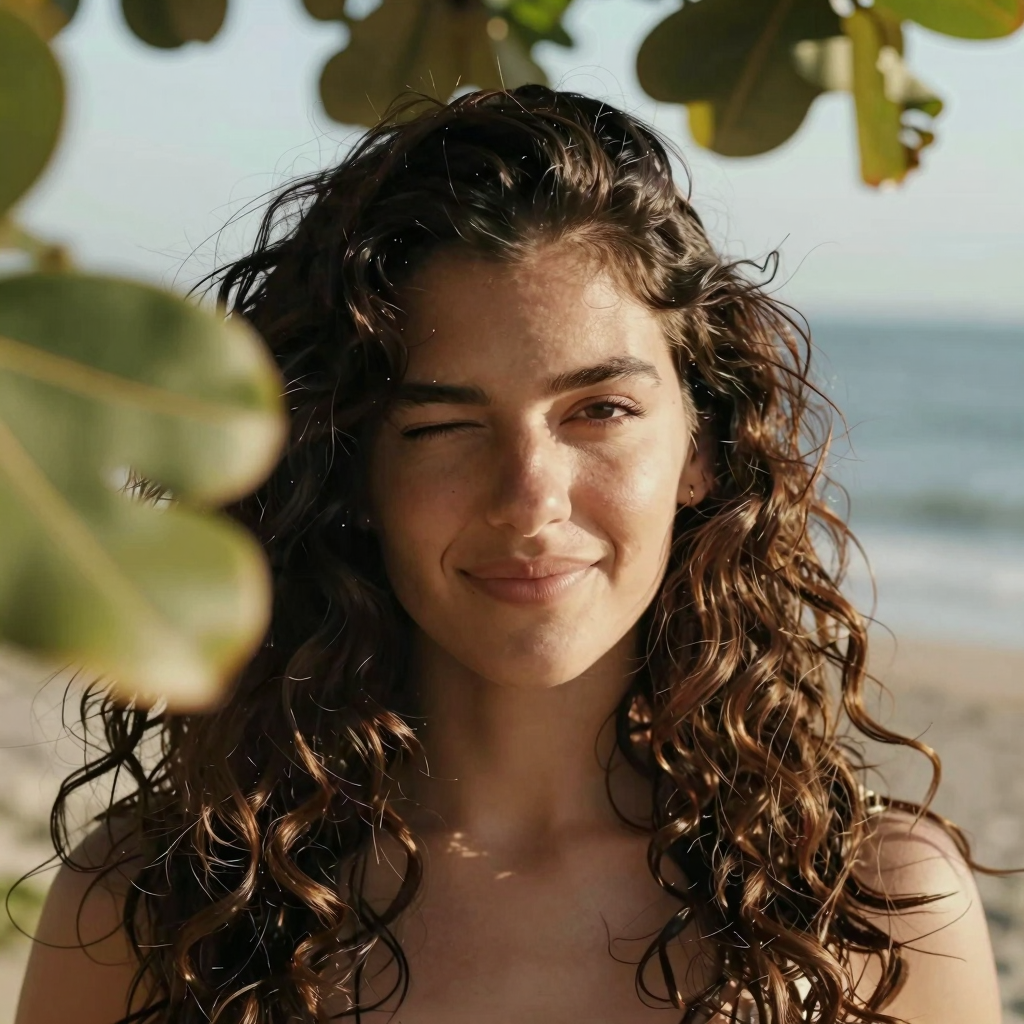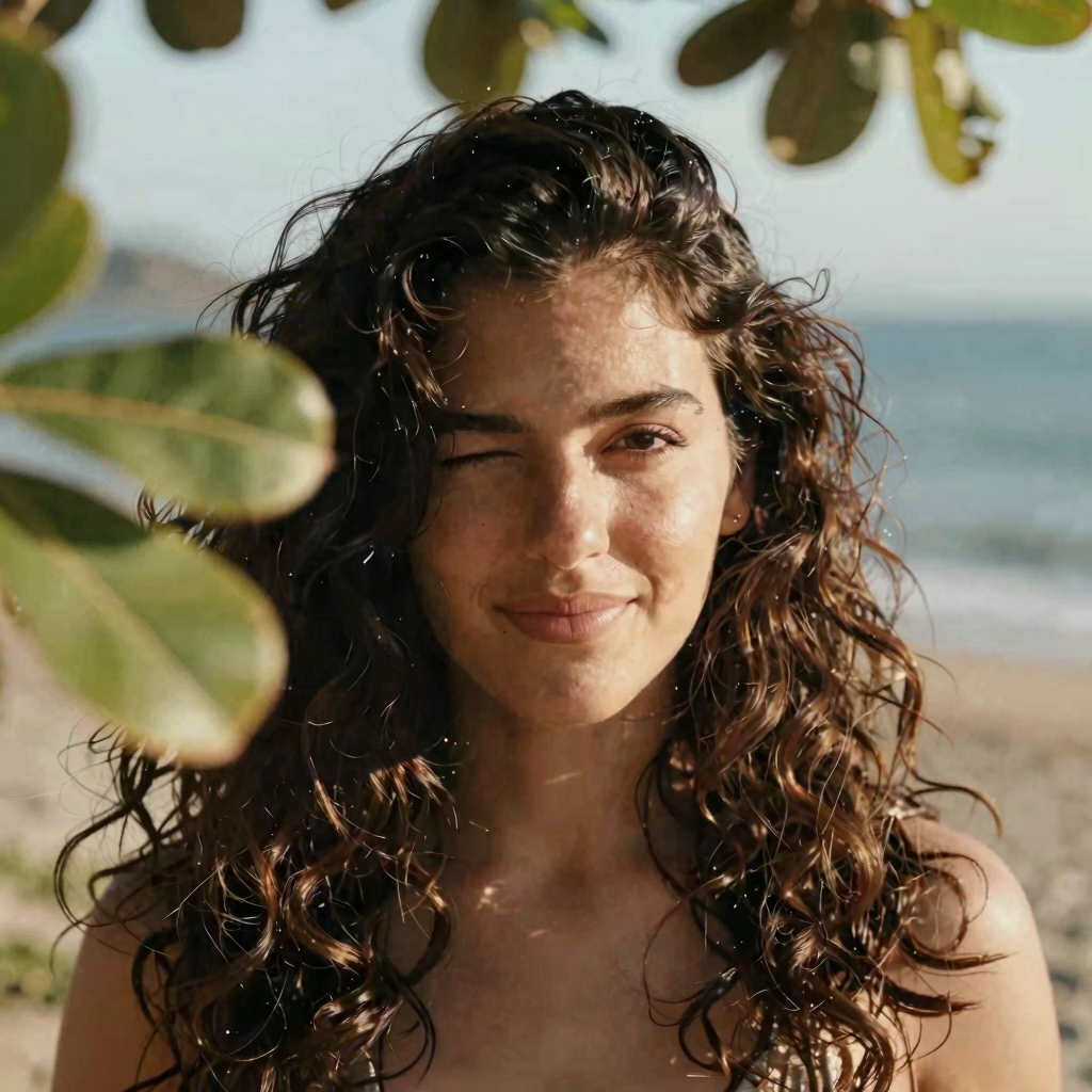 Latina female with thick wavy hair, blinking to the camera, there are some out of focus tree leaves in front of her. Breezy seaside light, warm tones, cinematic close-up.